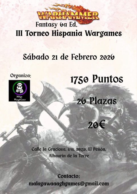 Prestad atención gentes del sur, porque a finales de marzo hay cita warhammera en Granada, donde el sábado, 28 de marzo de 2026, se celebrará el II Torneo de Warhammer Fantasy Battles Wargames Granada. Será un torneo de 6ª Pura (aunque se podrá utilizar todo el material oficial de White