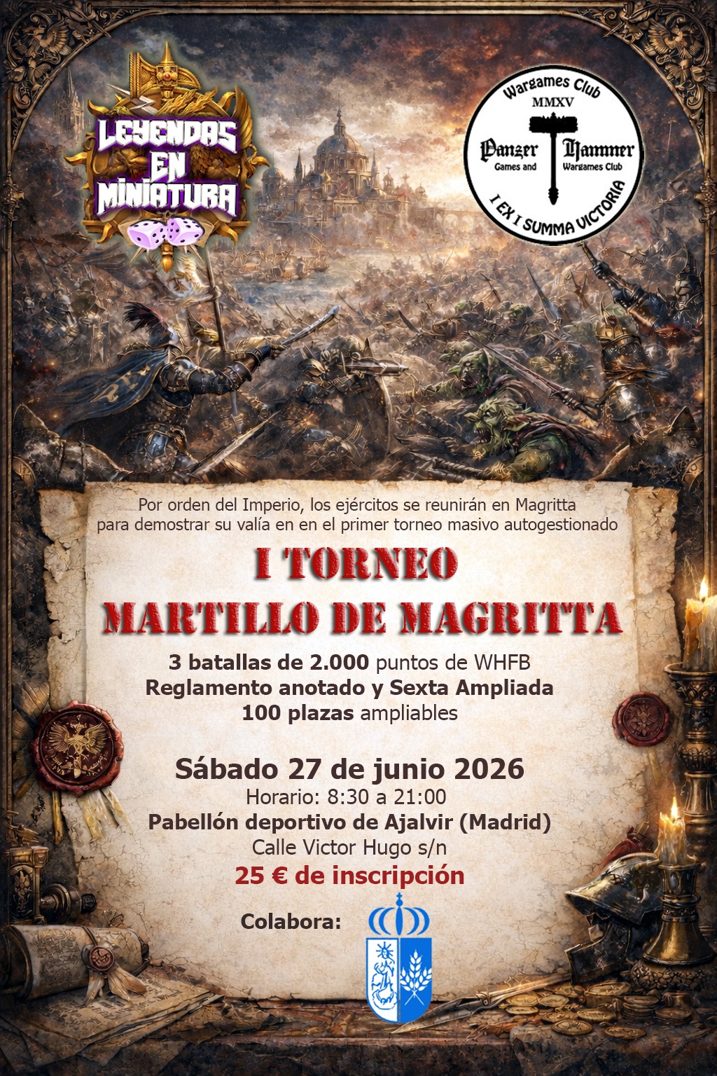 La cita está programada para el sábado 27 de junio de 2026, en Ajalvir (Madrid), y se espera llegar has las 116 plazas en un torneo de Sexta Ampliada, con listas de 2.000 puntos y con un coste de inscripción de 25 €, así que si te encaja la fórmula y quieres participar, manda un email cuanto antes, ya que las plazas están volando: