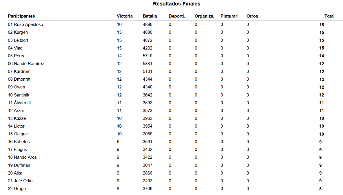 Al final de la jornada, «Russo Apestoso«, del club «Panzerhammer«, fue el campeón del torneo con un ejército de, tachán, «Enanos del Caos«.